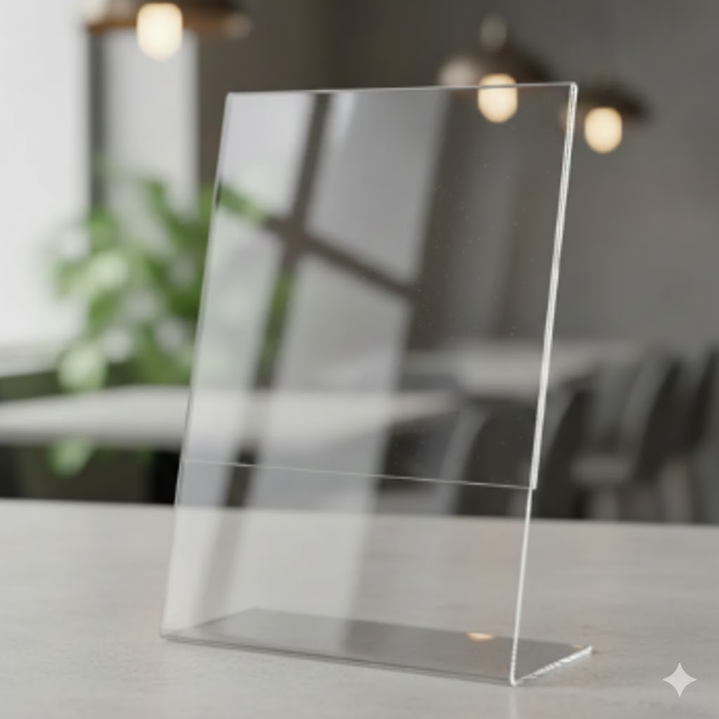 Insira uma folha impressa com sua mensagem e posicione o display em um local de destaque. O acrílico garante brilho, elegância e proteção, mantendo sua comunicação visível e profissional.